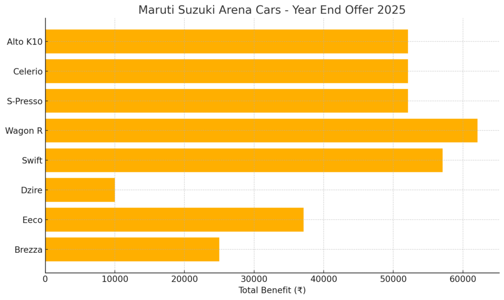 If you’re looking to buy a new car at the end of 2025, Maruti Suzuki’s year-end offers could be a golden opportunity. December is considered the best month to buy a car every year, and this year, Maruti has announced some amazing offers on both its Arena and Nexa lineups. In this blog, we’ll go into detail about each model’s discounts, finance options, exchange bonuses, and special dealership deals all in Hinglish, to help you make your decision easier.